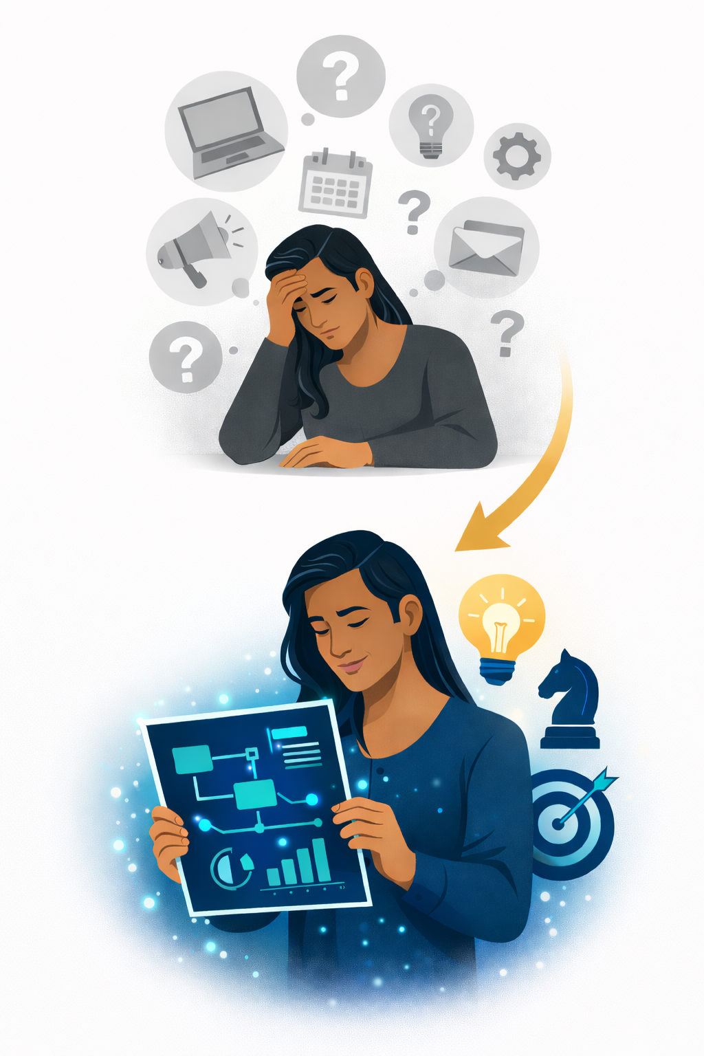 Within 24 hours you get a clear, phased implementation roadmap. What to build first. What to automate. What to stop doing. A document you can hand to a developer or execute yourself.